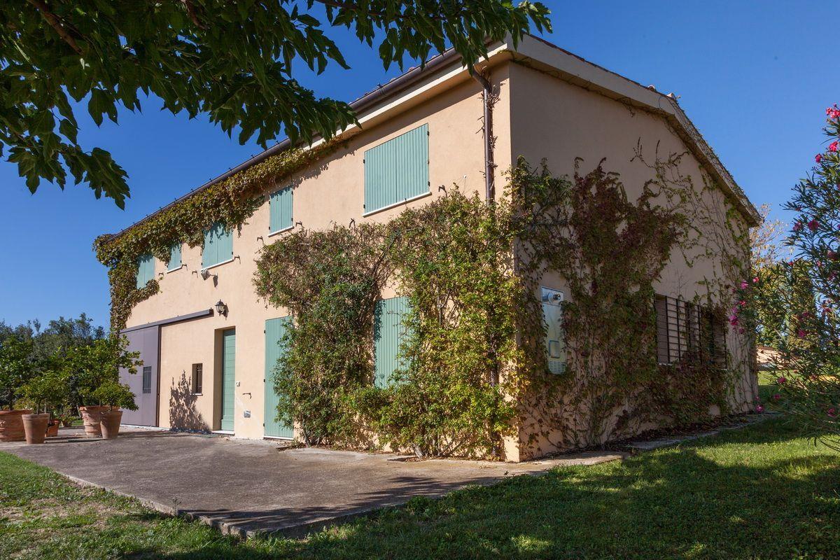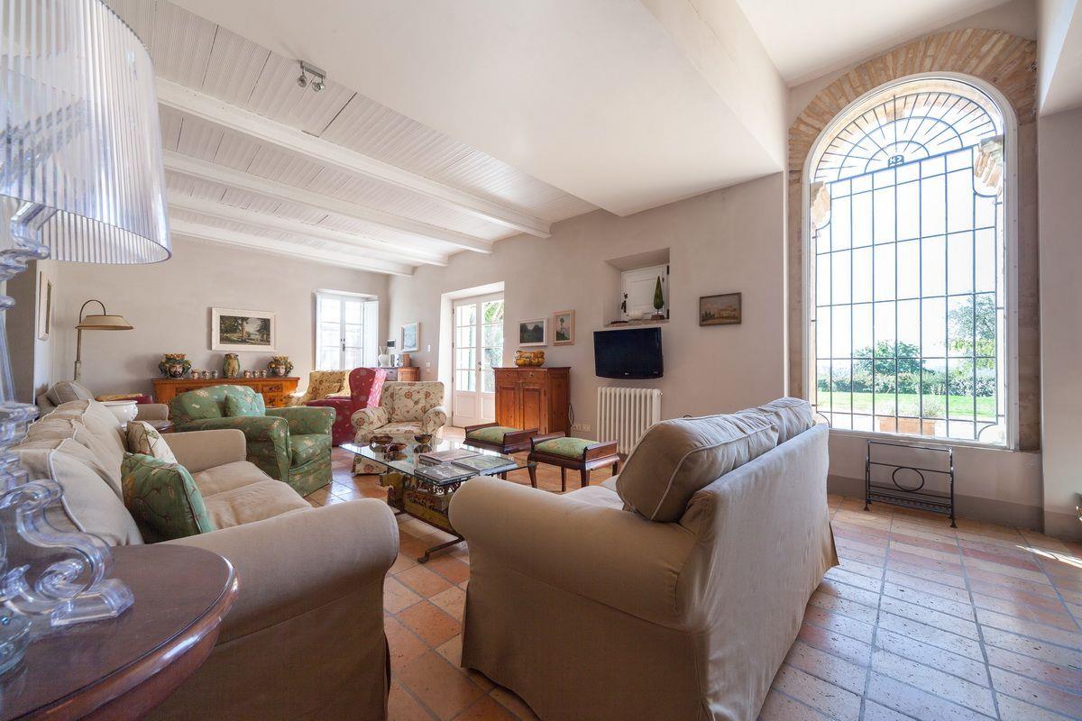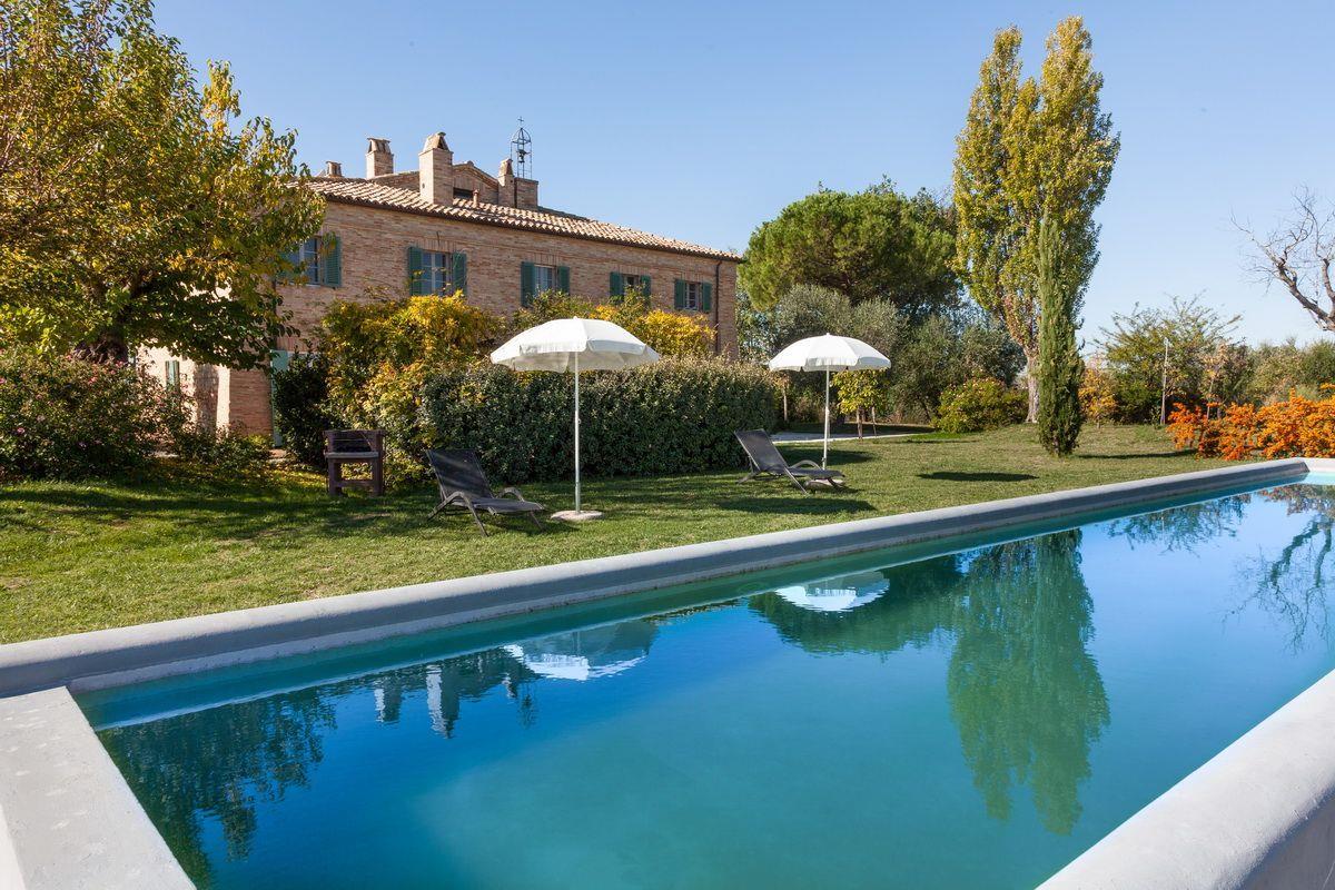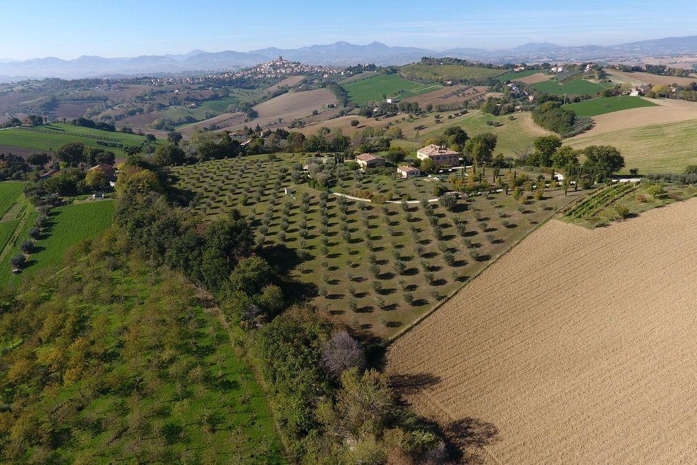 Старинное загородное имение располагается в холмистой местности региона Марке, всего в 20 км от моря. Недвижимость включает хозяйскую виллу, два флигеля и пристройку, окружённые частным земельным участком около 3 га с садом, бассейном и оливковой рощей.