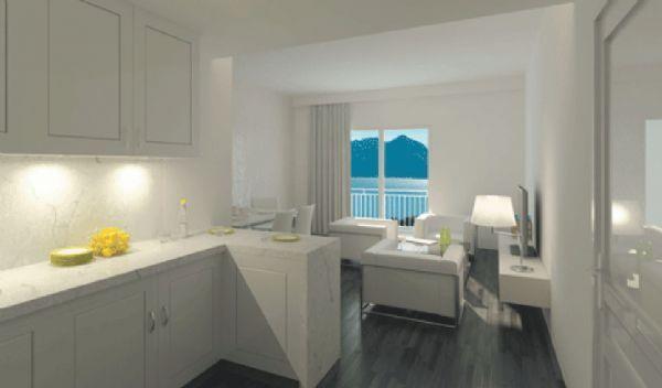 Апартаменты площадью 85 кв.м. состоят из: гостиная/столовая комната с мини-кухней, спальня с двуспальной кроватью, спальня с односпальной кроватью, ванная комната, балкон с видом на озеро, крытая терраса.