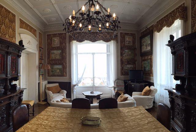 На первом этаже расположилась зона с жилыми помещениями: главная зала, столовая, салон для приемов гостей, большая музыкальная студия, читальный зал с камином, основная большая кухня, большая терраса;